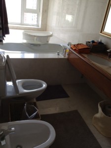 There is a shower opposite the tub behind me as I take the picture. I really just wanted to get in the bidet. Hunter is VERY interested in the bidet. Not sure if this could help or hurt potty training.