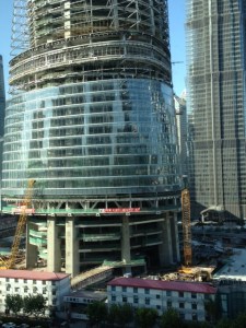 We spend hours watching the endless line of concrete mixer trucks, cranes, and “diggers”. They put the glass in pane by pane.
